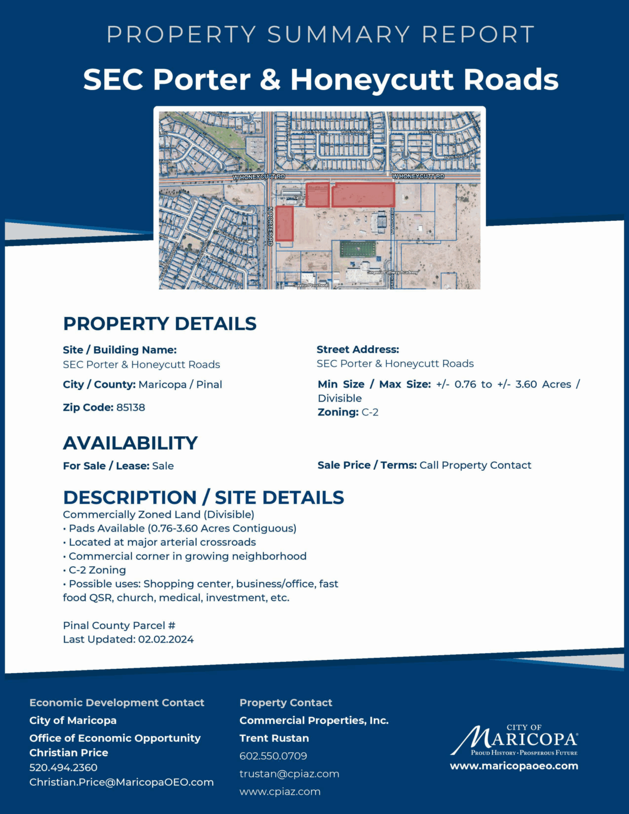 Description: Pads available (0.76-3.60 Acres Contiguous). Located at major arterial crossroads. Commercial corner in growing neighborhood. Possible uses: Shopping center, business/office, fast food QSR, church, medical, investment, etc.